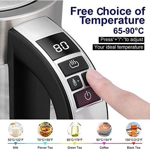- ?Safer Detailed Design?The handle of the water kettle electric is non-slip and insulated,which helps prevent scalds. The glass is engraved with a water level gauge,the spout is designed with a filter to filter tea leaves.certainly,It can also be used as a electric tea kettle.