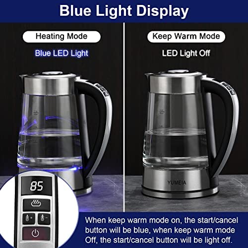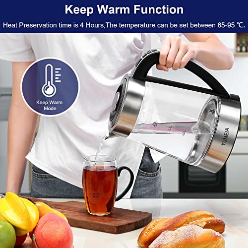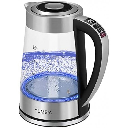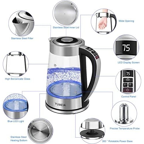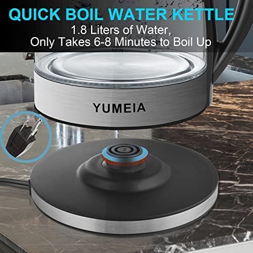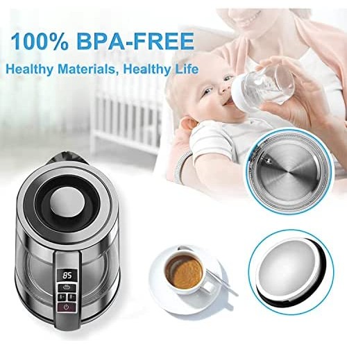 - ?1.8 Liter Tea Kettle Electric,Food Grade Material?The electric kettle made from Tempered Borosilicate glass,does not contain harmful substances such as BPA,all the water contact surfaces are constructed of food grade safety material,The bottom heating element is 100% stainless steel which can be effectively heat water.